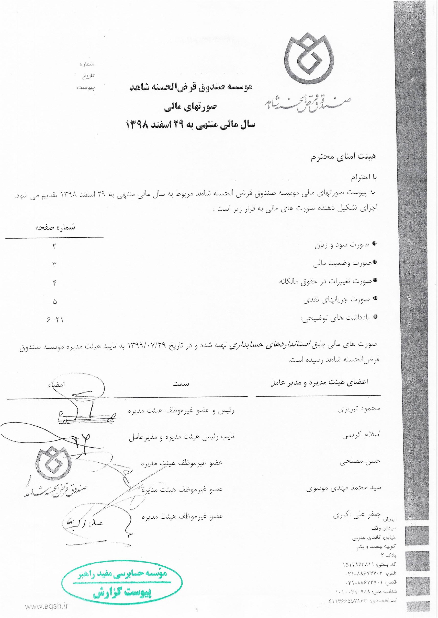 گزارش حسابرس مستقل و بازرس به انضمام صورتهای مالی برای سال مالی منتهی به 29 اسفند 1398 تقدیم می گردد.