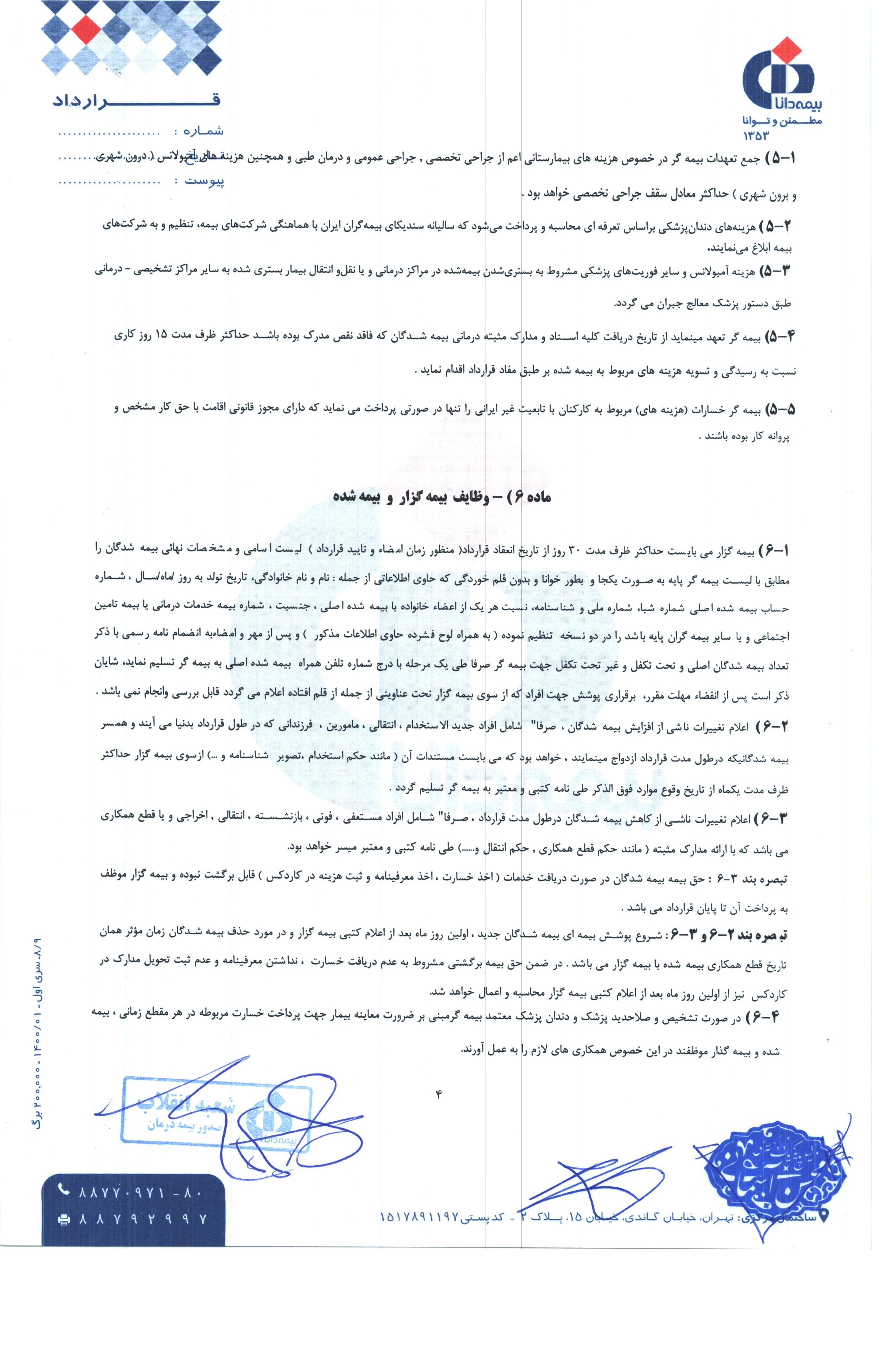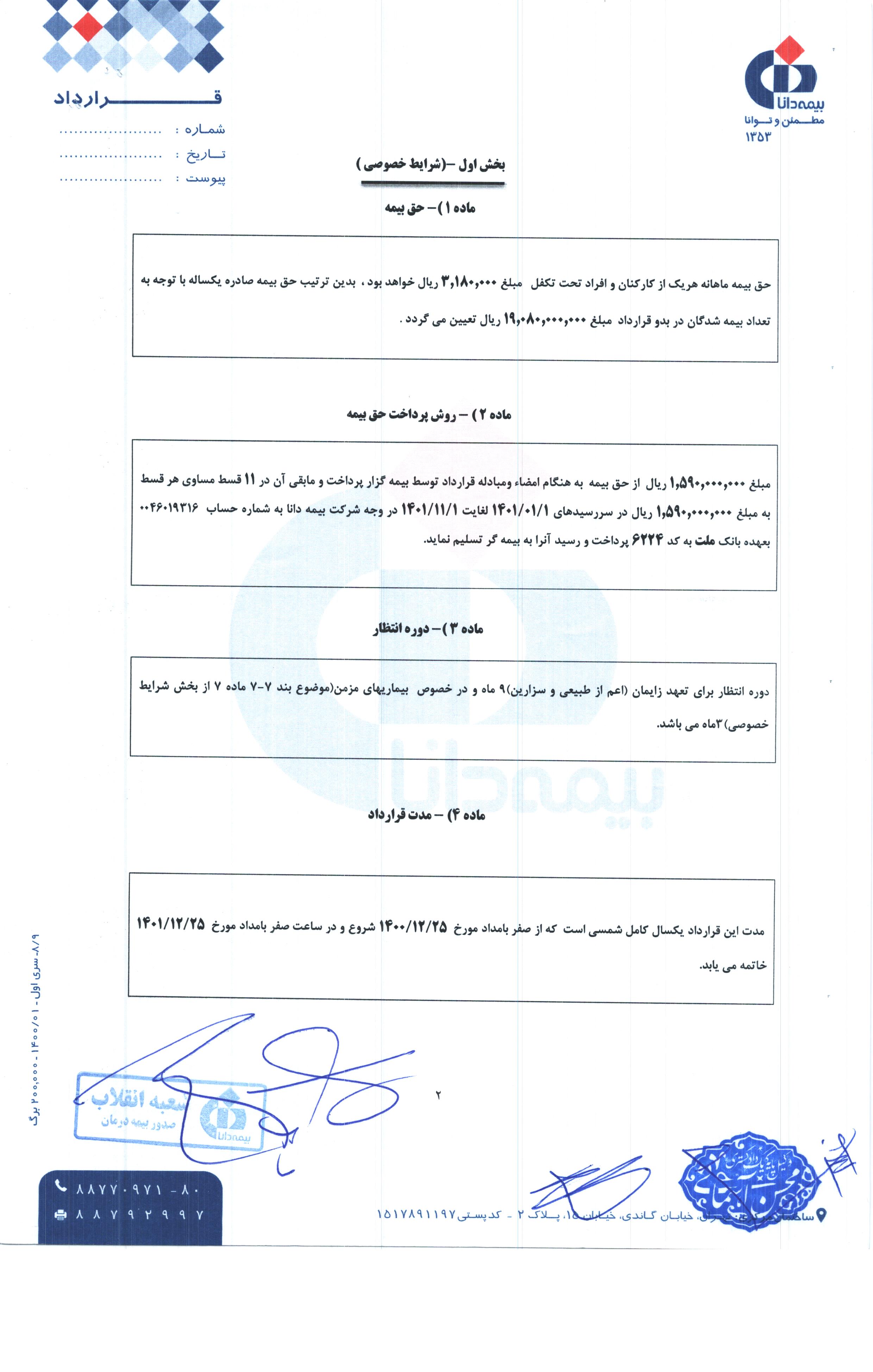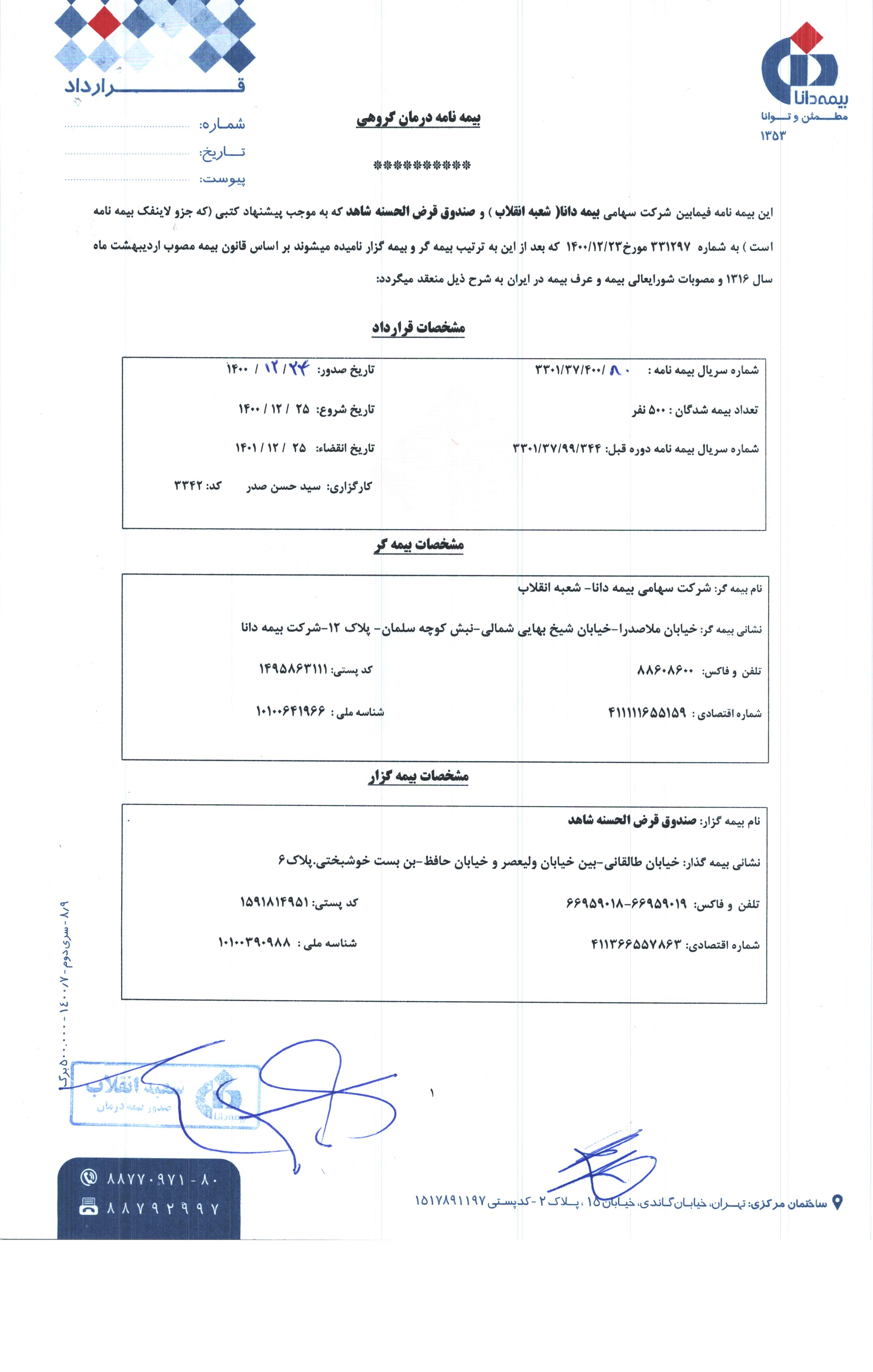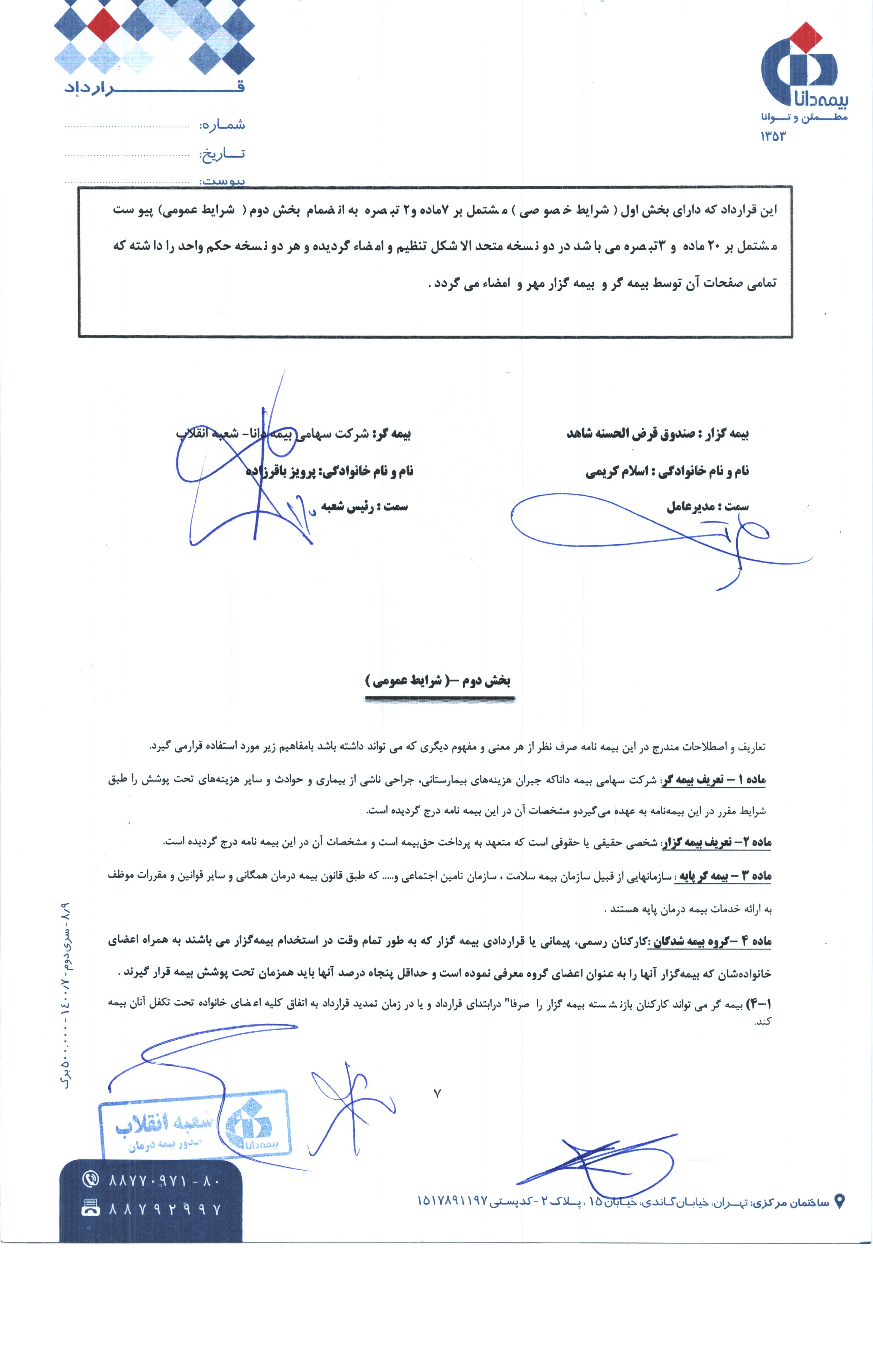 قرارداد بیمه تکمیلی 1400 کارکنان خدوم صندوق قرض الحسنه شاهد