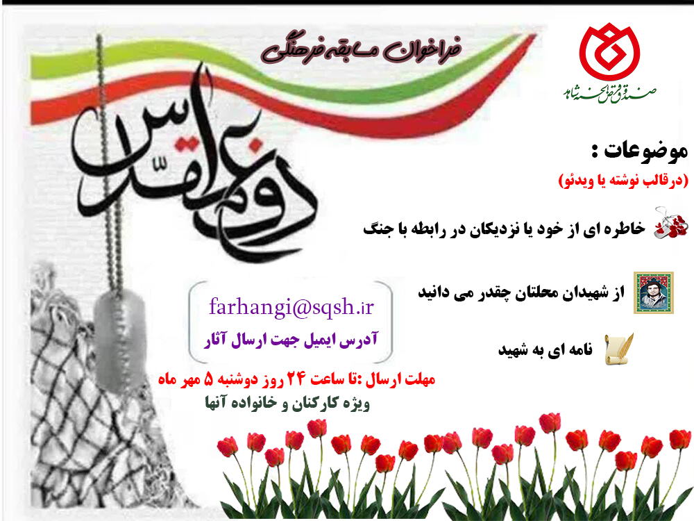 به گزارش روابط عمومی صندوق قرض الحسنه شاهد، به مناسبت چهلمین سالگرد هفته دفاع مقدس و به منظور ترویج فرهنگ ایثار و شهادت، مسابقه فرهنگی با موضوعات ذیل ویژه کارکنان صندوق و خانواده آنها برگزار میشود: