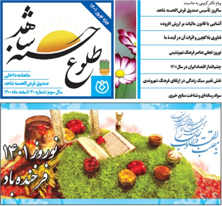 به گزارش روابط عمومی صندوق قرض الحسنه شاهد، دکتر مجتبی عباسی قادی مدیر طرح و برنامه با اشاره به انتشار شماره سی ام ماهنامه طلوع حسنه شاهد به عنوان ویژه نامه نوروزی از برگزاری مسابقه فرهنگی ویژه ایام نوروز 1401 در این شماره از این نشریه خبر داد و تصریح کرد: هیئت تحریریه ماهنامه طلوع حسنه شاهد قصد دارد به منظور ایجاد فراغت و انگیزه برای کارکنان و خانواده های محترم ایشان در ایام نوروز 1401 اقدام به برگزاری مسابقات فرهنگی نماید.