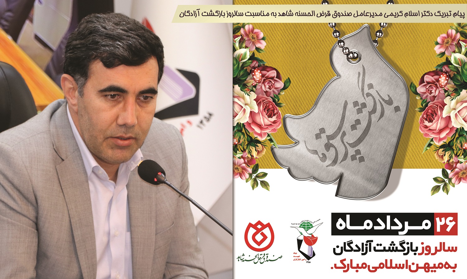 اینجانب بدینوسیله به نمایندگی از صندوق قرض الحسنه شاهد ضمن گرامیداشت سالروز ورود آزادگان به میهن اسلامی، به مقام شامخ این عزیزان ادای احترام کرده و خود را همواره قدردان فداکاری و ایستادگی آنها در مقابل دشمنان ملت ایران می دانم.