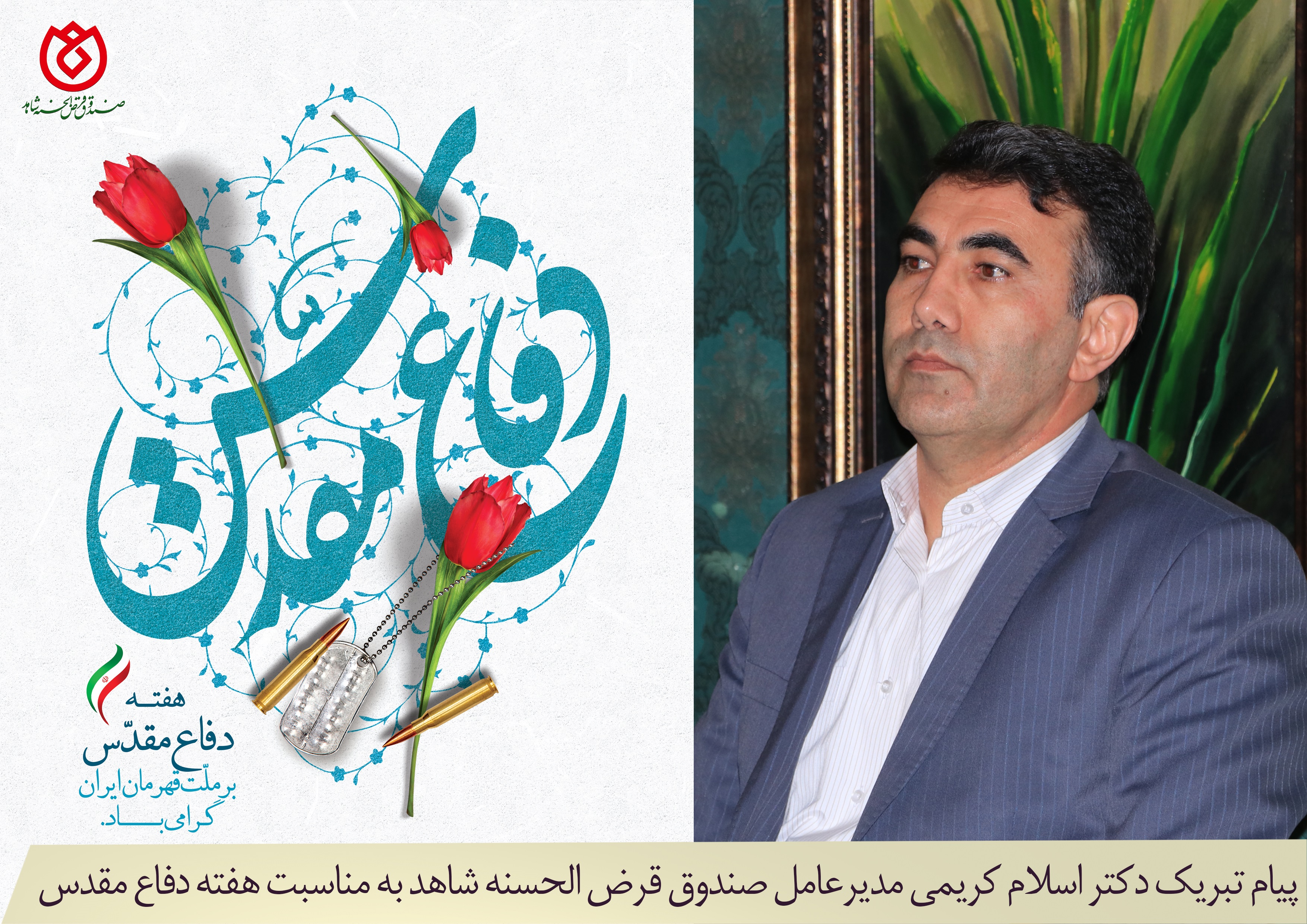 اینجانب به عنوان خادم خانواده های معظم و معزز شاهد و ایثارگر در صندوق قرض الحسنه شاهد، فرا رسیدن ۳۱ شهریور ماه آغاز هفته دفاع مقدس را صمیمانه محضر مردم شریف و انقلابی ایران به ویژه جانبازان، ایثارگران، آزادگان سرافراز، خانواده معظم شهدا و رهبر معظم انقلاب اسلامی تبریک و تهنیت عرض نموده، سربلندی و عزت ایران اسلامی را از درگاه خداوند متعال مسئلت می نمایم.