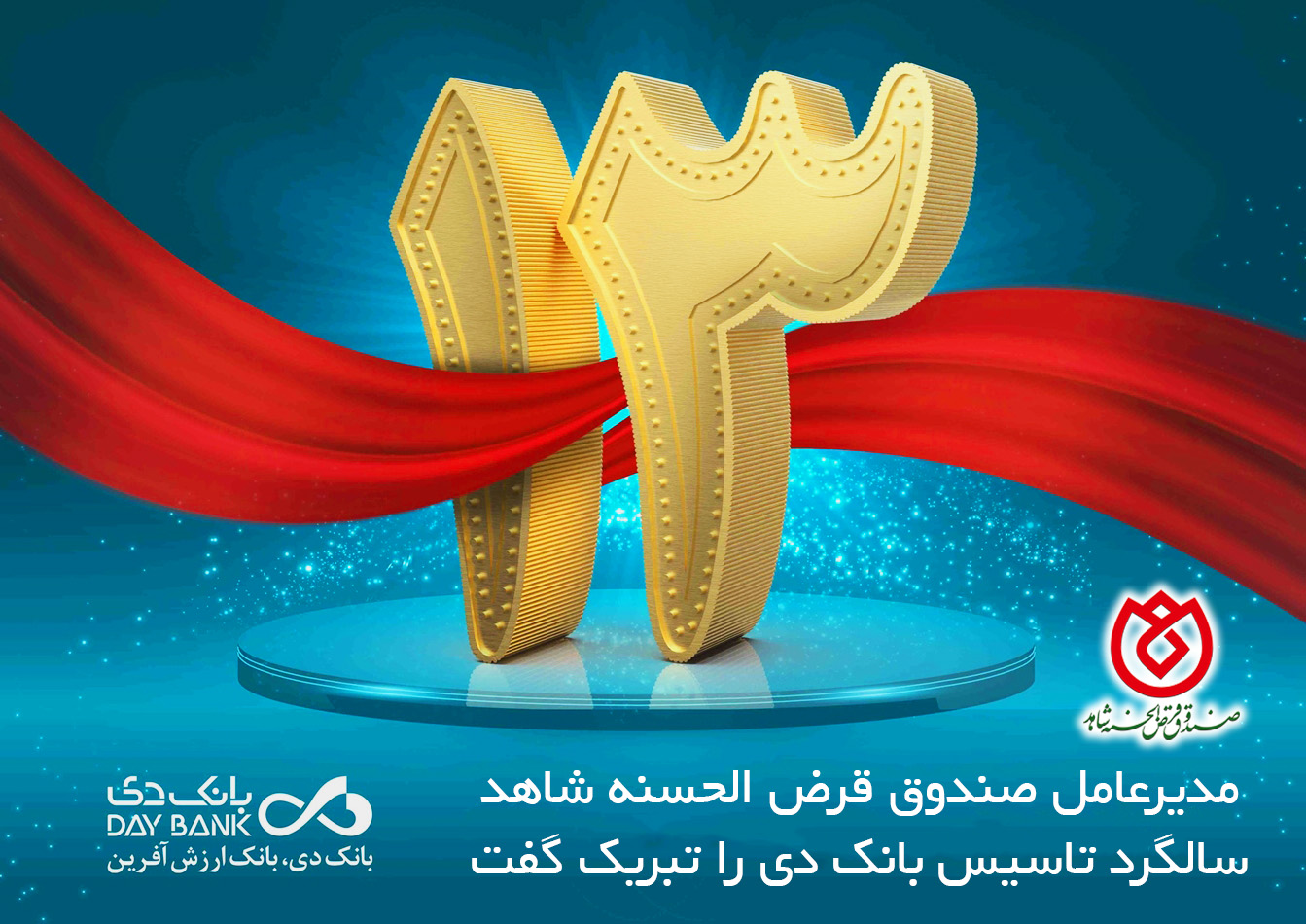 برادر ارجمند جناب آقای دکتر علیرضا قیطاسی مدیرعامل محترم بانک دی، بدینوسیله فرارسیدن سیزدهمین سالروز تاسیس بانک دی به عنوان یکی از جوان ترین و پویاترین بانک های خصوصی کشور را به نمایندگی از مجموعه صندوق قرض الحسنه شاهد محضر شما و تمامی دست اندرکاران این بانک، به ویژه خانواده های معظم و معزز شاهد و ایثارگر که صاحبان اصلی بانک دی هستند تبریک و تهنیت عرض می نمایم.