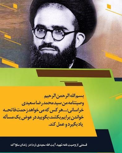 سید محمدرضا سعیدی (۱۳۰۸-۱۳۴۹ ه ش)، مشهور به شهید آیتالله سعیدی، از عالمان مبارز شیعی علیه حکومت پهلوی درقرن چهاردهم هجری شمسی بود و درمشهد و قم دانش آموخته و از محضر امام خمینی و آیت الله بروجردی بهره برده و به درجه اجتهاد رسید. ایشان ضمن تحصیل، تدریس و تبلیغ دین اسلام به فعالیتهای سیاسی و مبارزاتی علیه حکومت پهلوی پرداخته و در پیشبرد نهضت امام خمینی نقش موثری ایفا نمودند و از یاران انقلابی نزدیک امام خمینی قرار گرفت، از اینرو تحت تعقیب ساواک قرار گرفته و پس از شکنجههای بسیار در زندان، در شب ۲۱ خرداد در سن ۴۱ سالگی به مقام شهادت نائل آمد