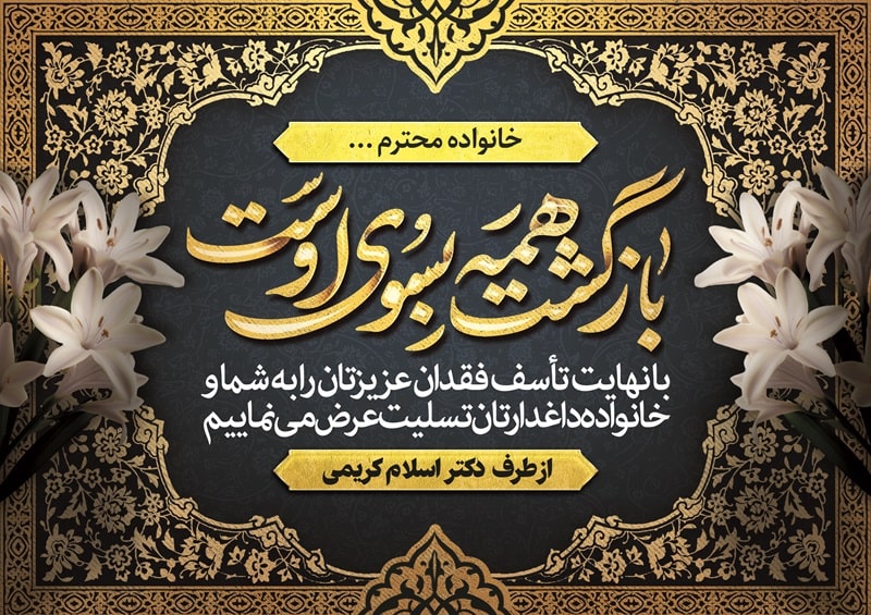 برادر گرامی جناب آقای محمدعلی سلیمی همکار محترم شاغل در ستاد مرکز، بدینوسیله به نمایندگی از تمامی همکاران صندوق قرض الحسنه شاهد درگذشت پدرگرامیتان را به شما و خانواده محترمتان تسلیت عرض نموده، برای آن عزیز سفر کرده رحمت و غفران الهی و برای شما و سایر بازماندگان صبر جمیل از درگاه ایزد منان مسئلت می نماییم.