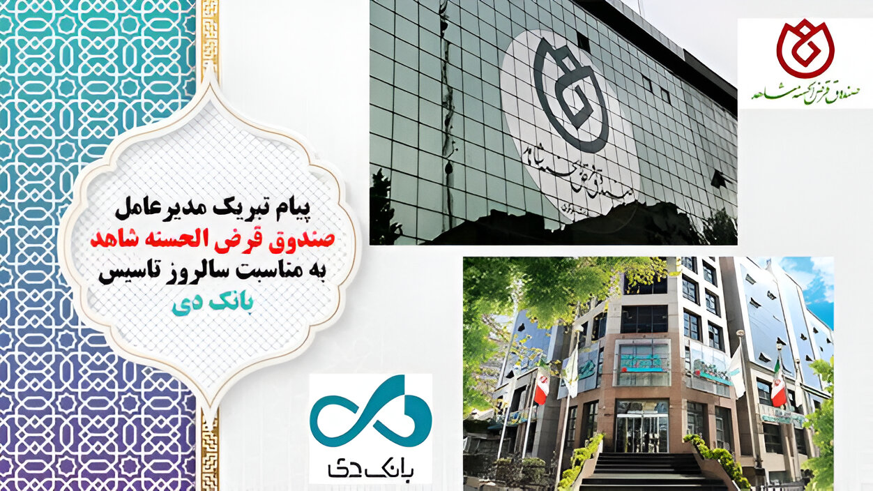بدینوسیله، اینجانب به نمایندگی از اعضا هیات مدیره و کارکنان صندوق قرضالحسنه شاهد، فرارسیدن این مناسبت فرخنده را به مدیرعامل پر تلاش و کوشا، برادر گرامی جناب آقای دکتر برات کریمی ، کارکنان گرانقدر و مشتریان و سهامداران آن بانک وزین و محترم تبریک و تهنیت عرض نموده و آرزوی سلامتی، توفیق و موفقیت روز افزون خانواده بزرگ بانک دی در مسیر خدمات رسانی شایسته و بایسته به ملت شریف ایران خصوصاً خانواده های معظم و معزز شهدا و ایثارگران را دارم.